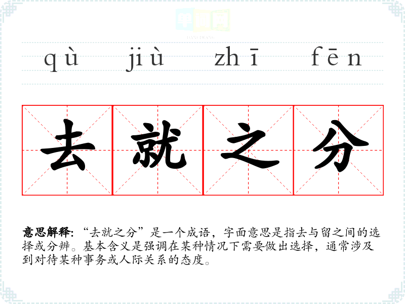 “去就之分”出自于古代的论述,最早见于《论语》中,孔子提到对待事情的态度和选择。随着时间的发展,这一成语逐渐演变为一种表达选择与判断的固定说法,常用于形容人们在生活中需要面对的选择。