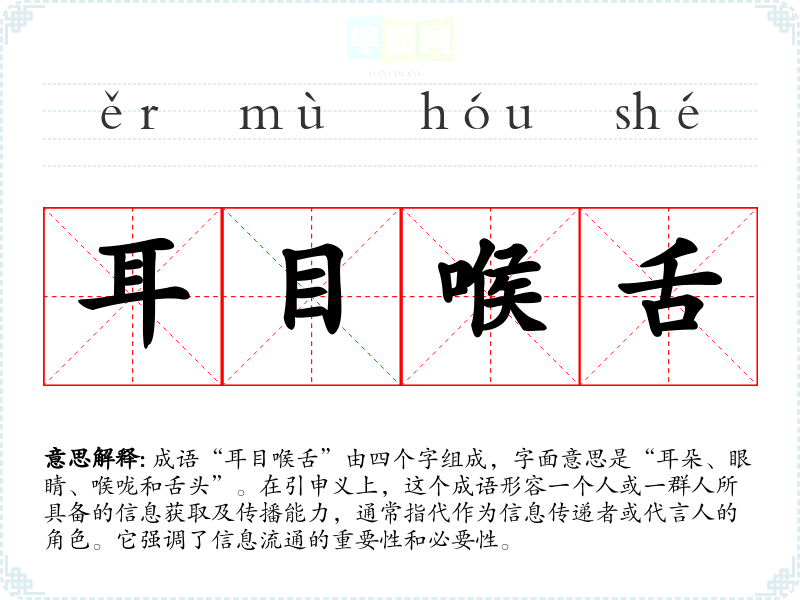 成语“耳目喉舌”由四个字组成,字面意思是“耳朵、眼睛、喉咙和舌头”。在引申义上,这个成语形容一个人或一群人所具备的信息获取及传播能力,通常指代作为信息传递者或代言人的角色。它强调了信息流通的重要性和必要性。