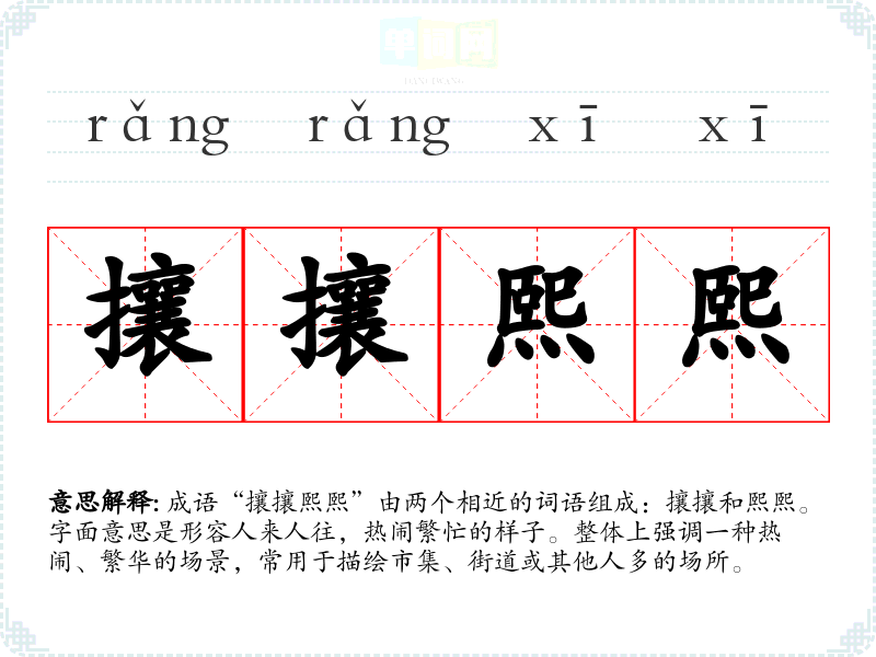 成语“攘攘熙熙”由两个相近的词语组成:攘攘和熙熙。字面意思是形容人来人往,热闹繁忙的样子。整体上强调一种热闹、繁华的场景,常用于描绘市集、街道或其他人多的场所。
