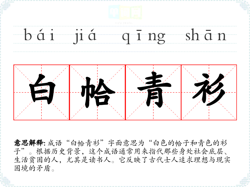 成语“白帢青衫”字面意思为“白色的帢子和青色的衫子”。根据历史背景,这个成语通常用来指代那些身处社会底层、生活贫困的人,尤其是读书人。它反映了古代士人追求理想与现实困境的矛盾。