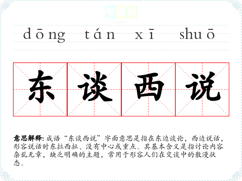 成语“东谈西说”字面意思是指在东边谈论,西边说话,形容说话时东拉西扯、没有中心或重点。其基本含义是指讨论内容杂乱无章,缺乏明确的主题,常用于形容人们在交谈中的散漫状态。