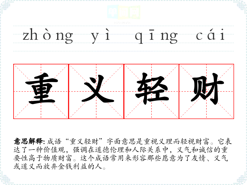成语“重义轻财”字面意思是重视义理而轻视财富。它表达了一种价值观,强调在道德伦理和人际关系中,义气和诚信的重要性高于物质财富。这个成语常用来形容那些愿意为了友情、义气或道义而放弃金钱利益的人。