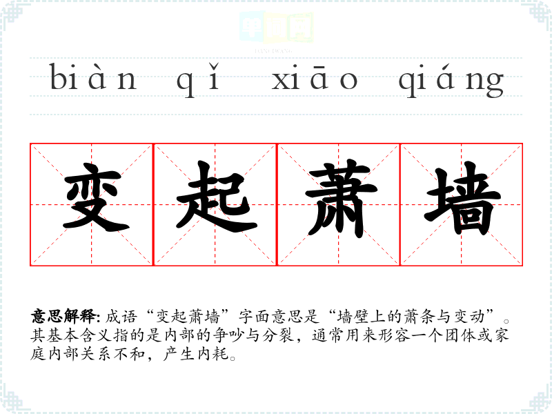 成语“变起萧墙”字面意思是“墙壁上的萧条与变动”。其基本含义指的是内部的争吵与分裂,通常用来形容一个团体或家庭内部关系不和,产生内耗。