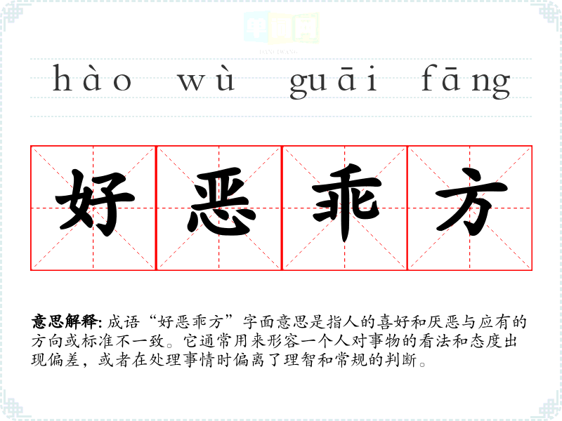 通过学“好恶乖方”,我对个人判断的影响有了更深的理解。这个成语不仅丰富了我的语言表达,也让我在实际生活中更加注意理性与情感的平衡。它在我语言学中占有重要位置,提醒我在表达时应追求客观与理智。