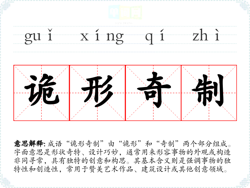 成语“诡形奇制”由“诡形”和“奇制”两个部分组成。字面意思是形状奇特、设计巧妙,通常用来形容事物的外观或构造非同寻常,具有独特的创意和构思。其基本含义则是强调事物的独特性和创造性,常用于赞美艺术作品、建筑设计或其他创意领域。