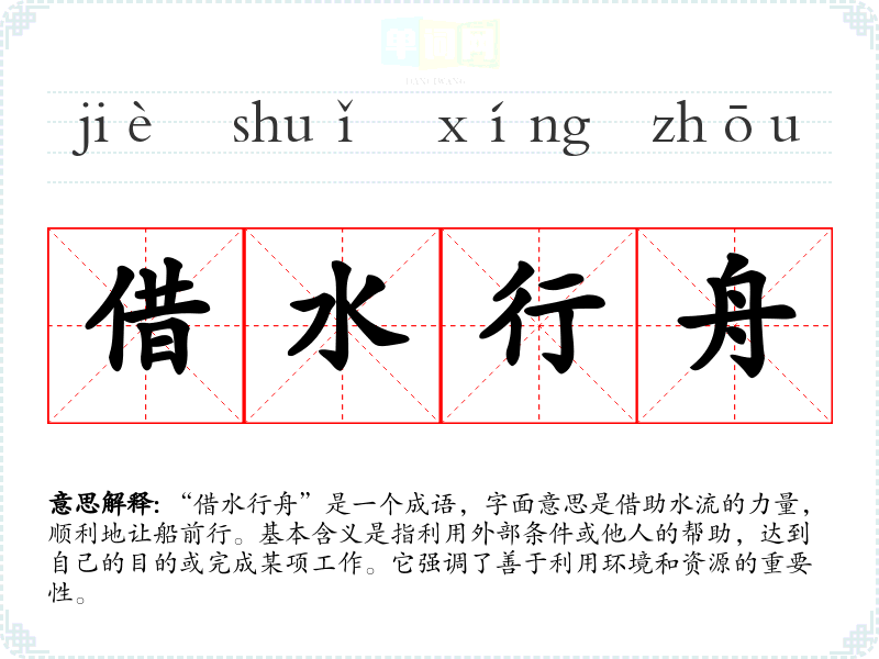 “借水行舟”是一个成语,字面意思是借助水流的力量,顺利地让船前行。基本含义是指利用外部条件或他人的帮助,达到自己的目的或完成某项工作。它强调了善于利用环境和资源的重要性。