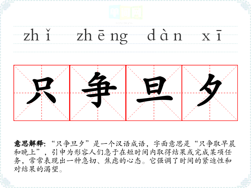 “只争旦夕”是一个汉语成语,字面意思是“只争取早晨和晚上”,引申为形容人们急于在短时间内取得结果或完成某项任务,常常表现出一种急切、焦虑的心态。它强调了时间的紧迫性和对结果的渴望。