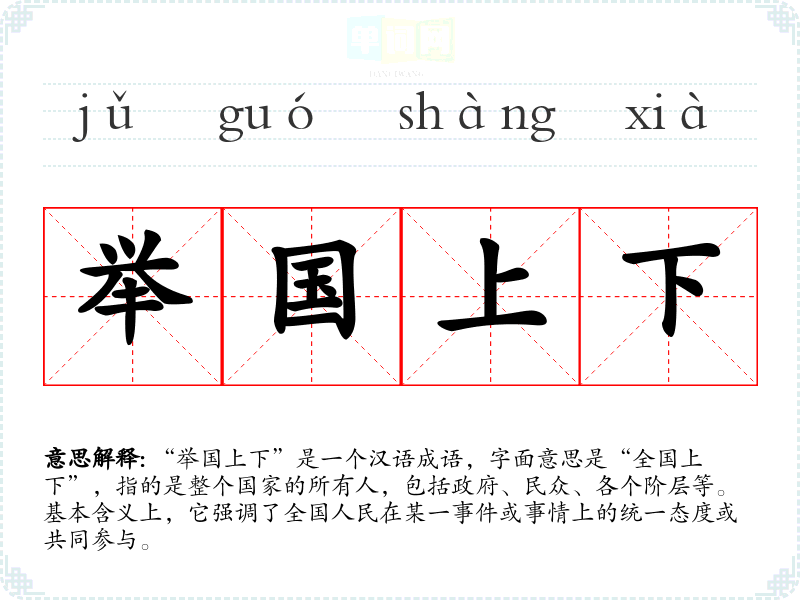 “举国上下”是一个汉语成语,字面意思是“全国上下”,指的是整个国家的所有人,包括政府、民众、各个阶层等。基本含义上,它强调了全国人民在某一**或事情上的统一态度或共同参与。