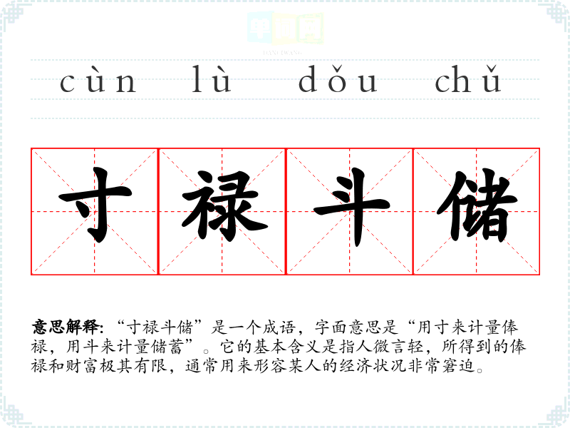 “寸禄斗储”是一个成语,字面意思是“用寸来计量俸禄,用斗来计量储蓄”。它的基本含义是指人微言轻,所得到的俸禄和财富极其有限,通常用来形容某人的经济状况非常窘迫。