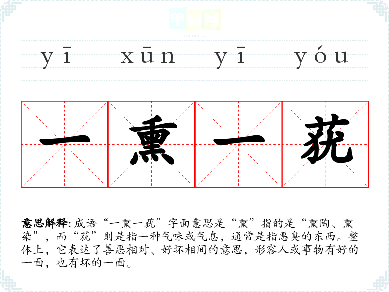 成语“一熏一莸”字面意思是“熏”指的是“熏陶、熏染”,而“莸”则是指一种气味或气息,通常是指恶臭的东西。整体上,它表达了善恶相对、好坏相间的意思,形容人或事物有好的一面,也有坏的一面。