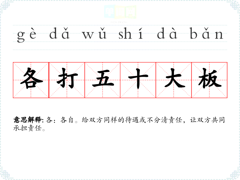 | 各打五十大板 | 各:各自。给双方同样的待遇或不分清责任,让双方共同承担责任。 |