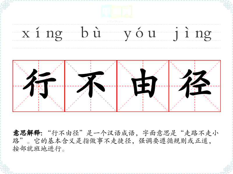 “行不由径”是一个汉语成语,字面意思是“走路不走小路”。它的基本含义是指做事不走捷径,强调要遵循规则或正道,按部就班地进行。