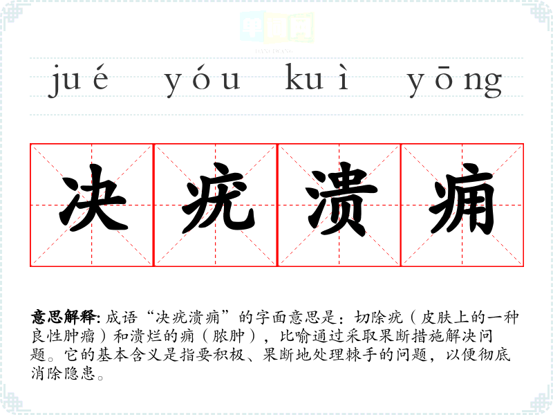 成语“决疣溃痈”的字面意思是:切除疣(皮肤上的一种良性肿瘤)和溃烂的痈(脓肿),比喻通过采取果断措施解决问题。它的基本含义是指要积极、果断地处理棘手的问题,以便彻底消除隐患。