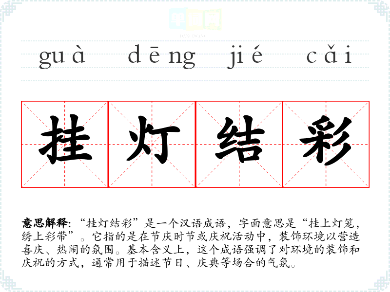 “挂灯结彩”是一个汉语成语,字面意思是“挂上灯笼,绣上彩带”。它指的是在节庆时节或庆祝活动中,装饰环境以营造喜庆、热闹的氛围。基本含义上,这个成语强调了对环境的装饰和庆祝的方式,通常用于描述节日、庆典等场合的气氛。