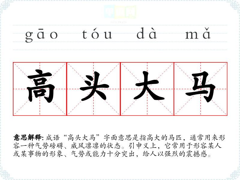 成语“高头大马”字面意思是指高大的马匹,通常用来形容一种气势磅礴、威风凛凛的状态。引申义上,它常用于形容某人或某事物的形象、气势或能力十分突出,给人以强烈的震撼感。