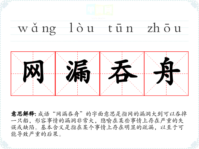 成语“网漏吞舟”的字面意思是指网的漏洞大到可以吞掉一只船,形容事情的漏洞非常大,隐喻在某些事情上存在严重的失误或缺陷。基本含义是指在某个事情上存在明显的疏漏,以至于可能导致严重的后果。