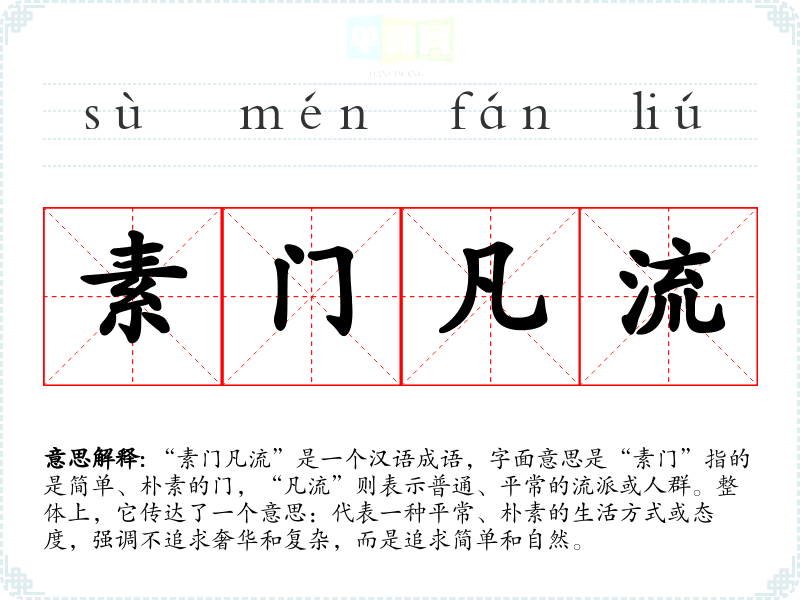 “素门凡流”是一个汉语成语,字面意思是“素门”指的是简单、朴素的门,“凡流”则表示普通、平常的流派或人群。整体上,它传达了一个意思:代表一种平常、朴素的生活方式或态度,强调不追求奢华和复杂,而是追求简单和自然。