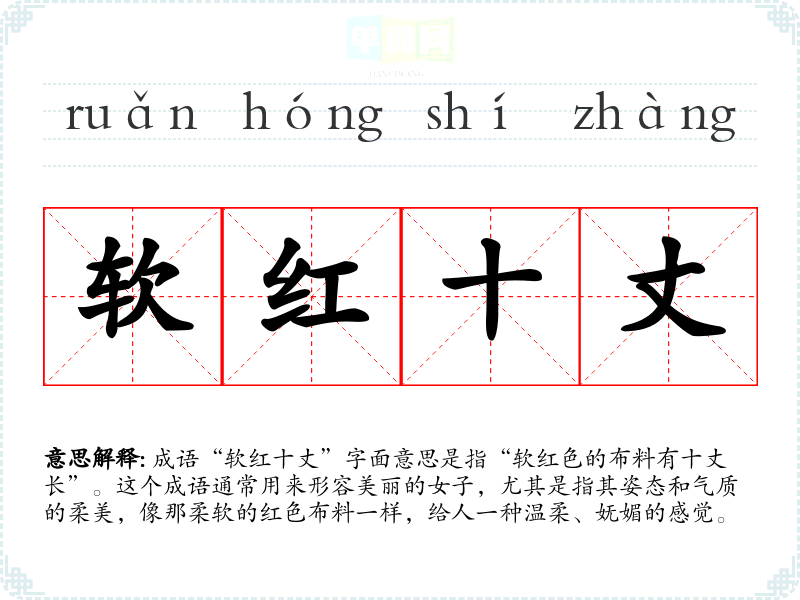 成语“软红十丈”字面意思是指“软红色的布料有十丈长”。这个成语通常用来形容美丽的女子,尤其是指其姿态和气质的柔美,像那柔软的红色布料一样,给人一种温柔、妩媚的感觉。