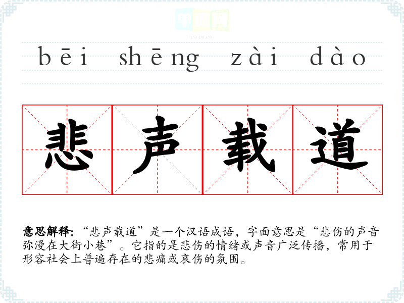 “悲声载道”是一个汉语成语,字面意思是“悲伤的声音弥漫在大街小巷”。它指的是悲伤的情绪或声音广泛传播,常用于形容社会上普遍存在的悲痛或哀伤的氛围。