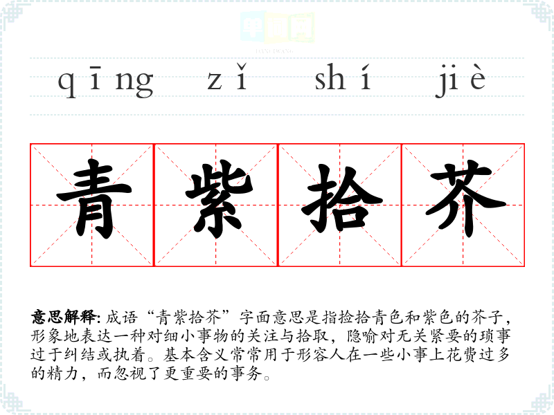 成语“青紫拾芥”字面意思是指捡拾青色和紫色的芥子,形象地表达一种对细小事物的关注与拾取,隐喻对无关紧要的琐事过于纠结或执着。基本含义常常用于形容人在一些小事上花费过多的精力,而忽视了更重要的事务。
