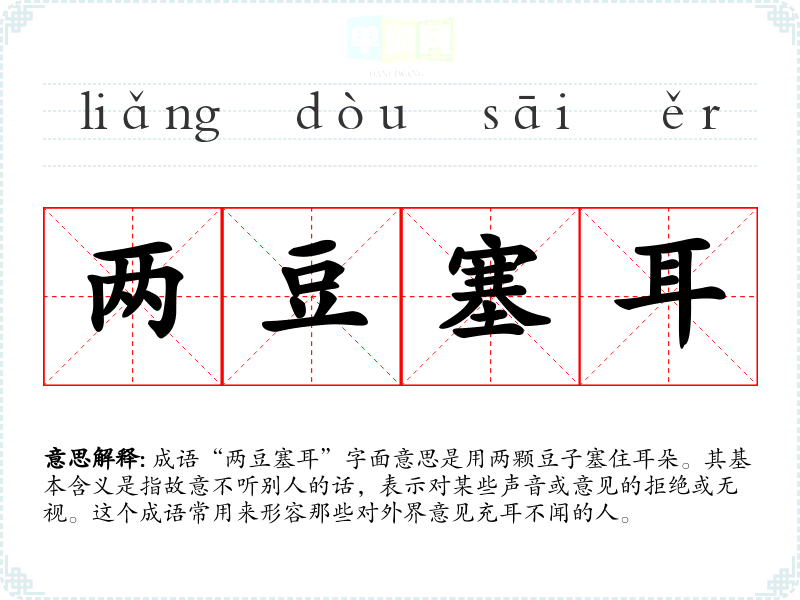 成语“两豆塞耳”字面意思是用两颗豆子塞住耳朵。其基本含义是指故意不听别人的话,表示对某些声音或意见的拒绝或无视。这个成语常用来形容那些对外界意见充耳不闻的人。