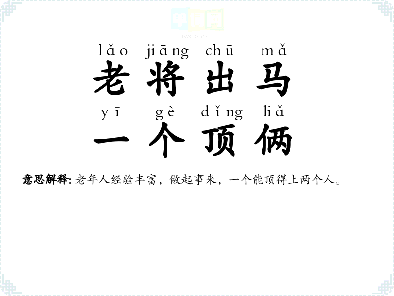 | 老将出马,一个顶俩 | 老年人经验丰富,做起事来,一个能顶得上两个人。 |