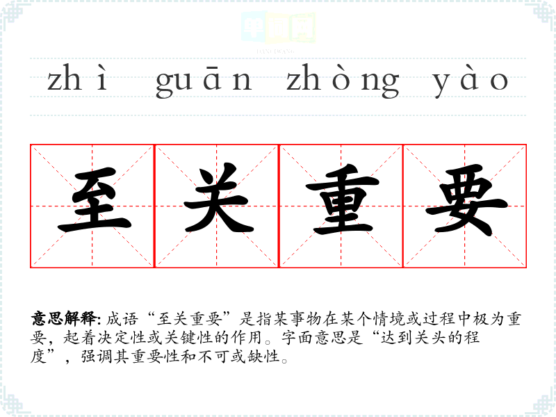 成语“至关重要”是指某事物在某个情境或过程中极为重要,起着决定性或关键性的作用。字面意思是“达到关头的程度”,强调其重要性和不可或缺性。