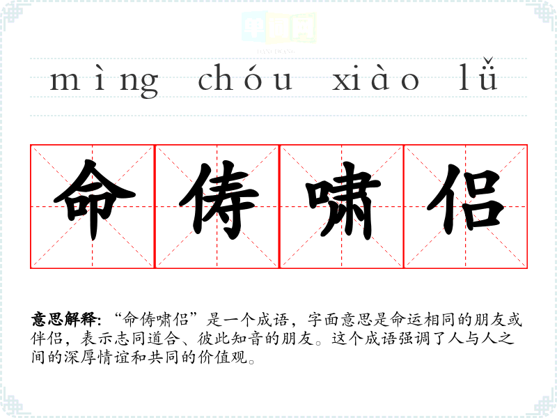 “命俦啸侣”是一个成语,字面意思是命运相同的朋友或伴侣,表示志同道合、彼此知音的朋友。这个成语强调了人与人之间的深厚情谊和共同的价值观。