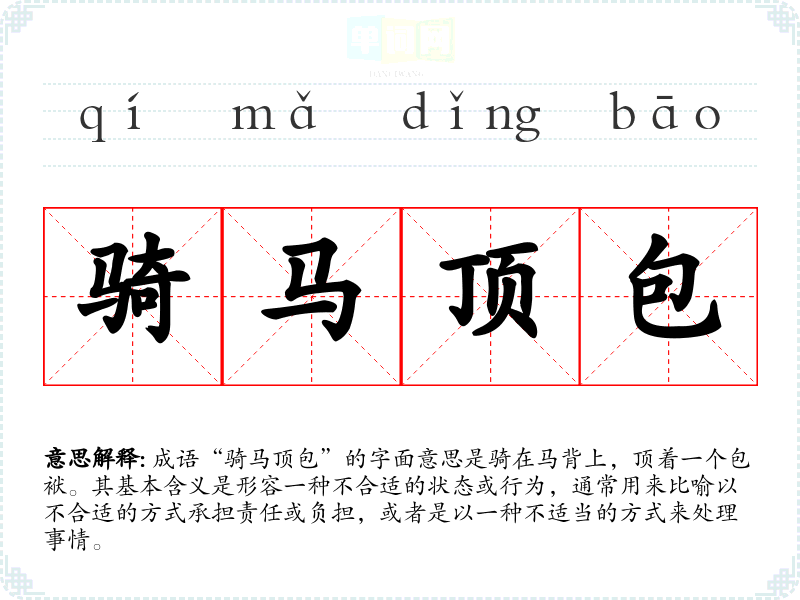 成语“骑马顶包”的字面意思是骑在马背上,顶着一个包袱。其基本含义是形容一种不合适的状态或行为,通常用来比喻以不合适的方式承担责任或负担,或者是以一种不适当的方式来处理事情。