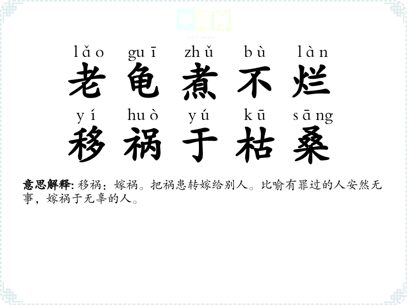 | 老龟煮不烂,移祸于枯桑 | 移祸:嫁祸。把祸患转嫁给别人。比喻有罪过的人安然无事,嫁祸于无辜的人。 |