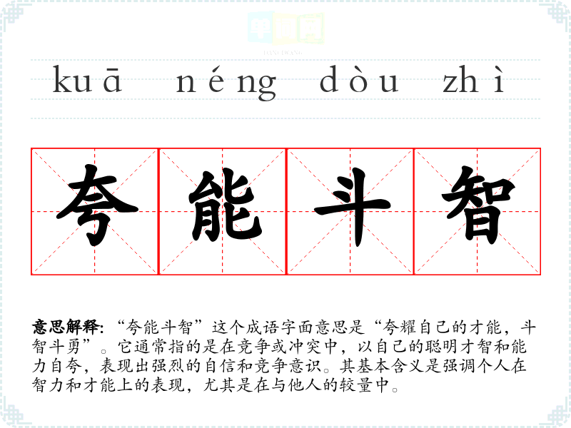 “夸能斗智”这个成语字面意思是“夸耀自己的才能,斗智斗勇”。它通常指的是在竞争或冲突中,以自己的聪明才智和能力自夸,表现出强烈的自信和竞争意识。其基本含义是强调个人在智力和才能上的表现,尤其是在与他人的较量中。