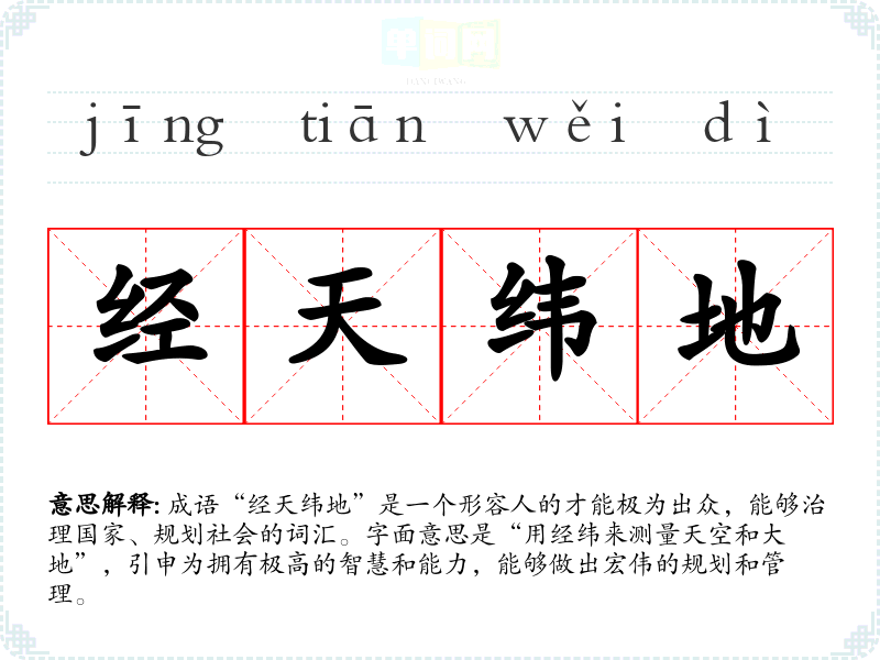 成语“经天纬地”是一个形容人的才能极为出众,能够治理国家、规划社会的词汇。字面意思是“用经纬来测量天空和大地”,引申为拥有极高的智慧和能力,能够做出宏伟的规划和管理。