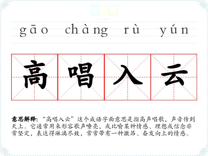 “高唱入云”这个成语字面意思是指高声唱歌,声音传到天上。它通常用来形容歌声嘹亮,或比喻某种情感、理想或信念非常坚定,表达得淋漓尽致,常常带有一种激昂、奋发向上的情感。