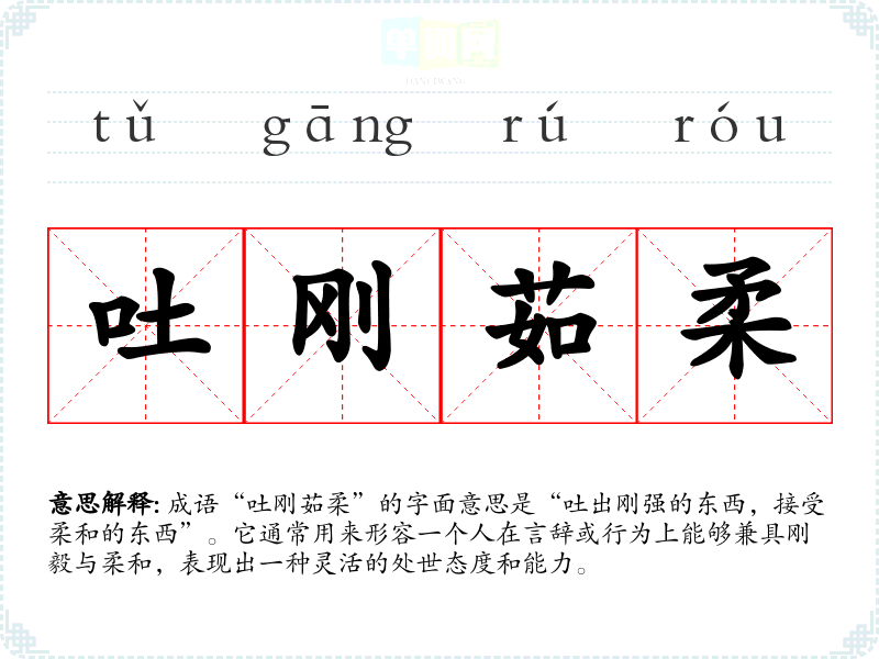 成语“吐刚茹柔”的字面意思是“吐出刚强的东西,接受柔和的东西”。它通常用来形容一个人在言辞或行为上能够兼具刚毅与柔和,表现出一种灵活的处世态度和能力。