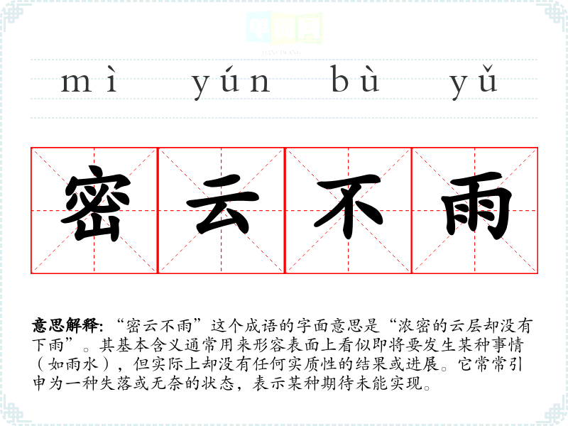 “密云不雨”这个成语的字面意思是“浓密的云层却没有下雨”。其基本含义通常用来形容表面上看似即将要发生某种事情(如雨水),但实际上却没有任何实质性的结果或进展。它常常引申为一种失落或无奈的状态,表示某种期待未能实现。