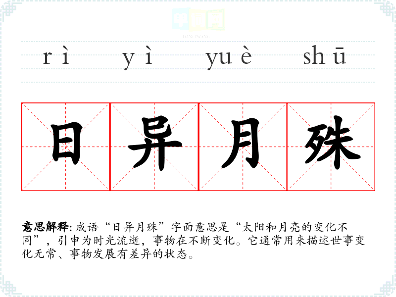 成语“日异月殊”字面意思是“太阳和月亮的变化不同”,引申为时光流逝,事物在不断变化。它通常用来描述世事变化无常、事物发展有差异的状态。