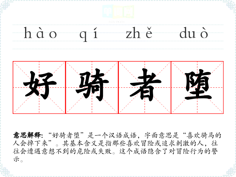 “好骑者堕”是一个汉语成语,字面意思是“喜欢骑马的人会掉下来”。其基本含义是指那些喜欢冒险或追求刺激的人,往往会遭遇意想不到的危险或失败。这个成语隐含了对冒险行为的警示。