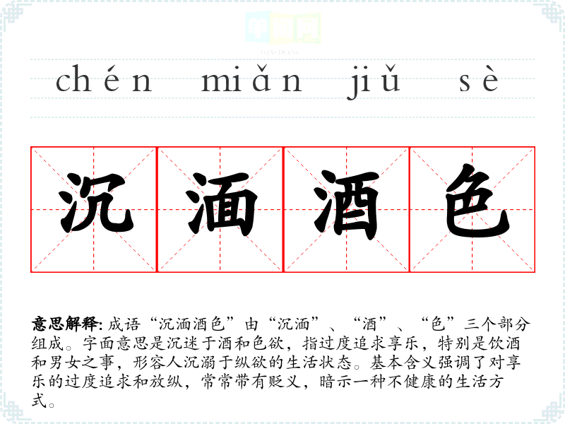 成语“沉湎酒色”由“沉湎”、“酒”、“色”三个部分组成。字面意思是沉迷于酒和色欲,指过度追求享乐,特别是饮酒和男女之事,形容人沉溺于纵欲的生活状态。基本含义强调了对享乐的过度追求和放纵,常常带有贬义,暗示一种不健康的生活方式。