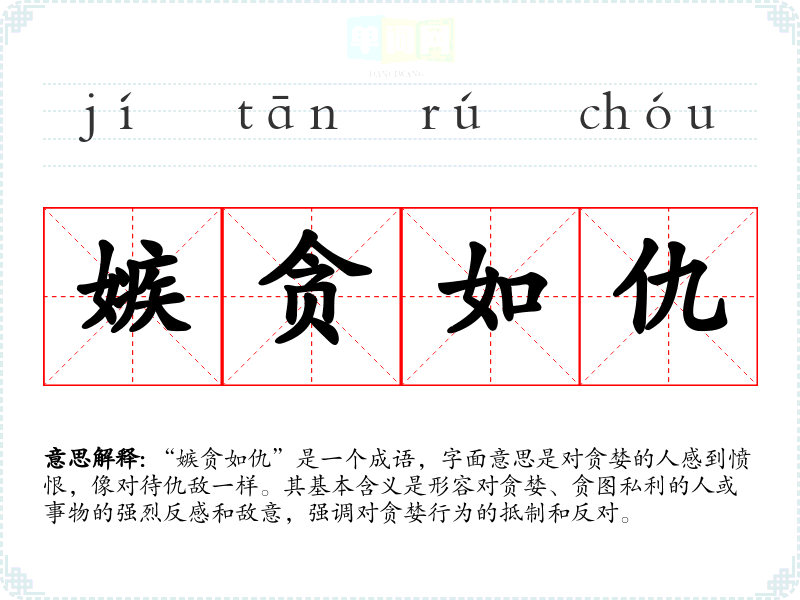 “嫉贪如仇”是一个成语,字面意思是对贪婪的人感到愤恨,像对待仇敌一样。其基本含义是形容对贪婪、贪图私利的人或事物的强烈反感和敌意,强调对贪婪行为的抵制和反对。