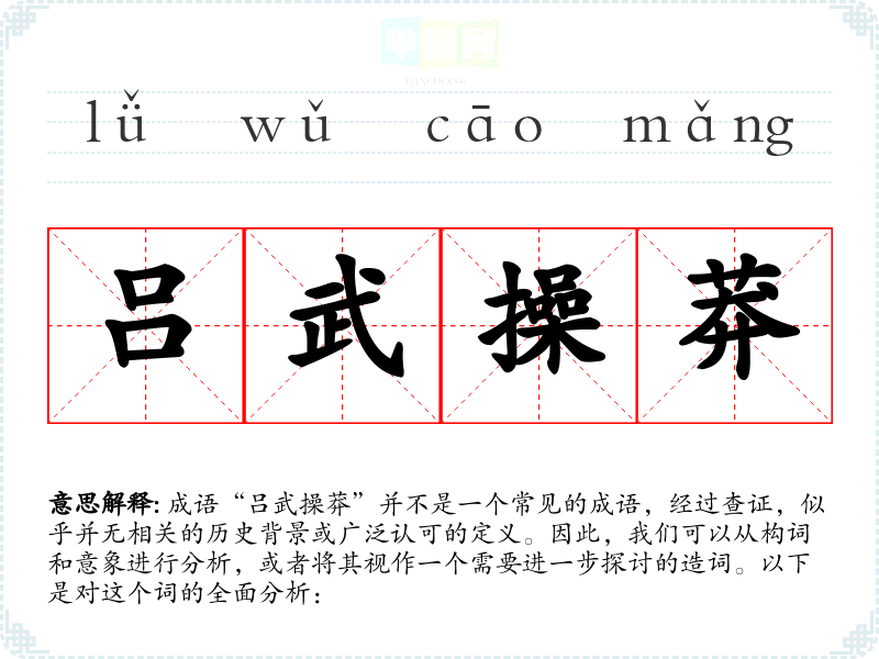 成语“吕武操莽”并不是一个常见的成语,经过查证,似乎并无相关的历史背景或广泛认可的定义。因此,我们可以从构词和意象进行分析,或者将其视作一个需要进一步探讨的造词。以下是对这个词的全面分析: