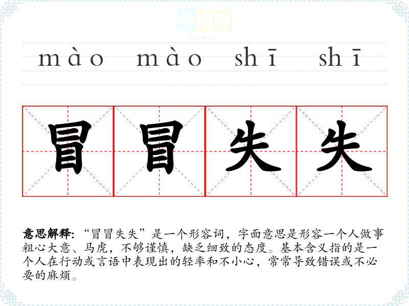 “冒冒失失”是一个形容词,字面意思是形容一个人做事粗心大意、马虎,不够谨慎,缺乏细致的态度。基本含义指的是一个人在行动或言语中表现出的轻率和不小心,常常导致错误或不必要的麻烦。