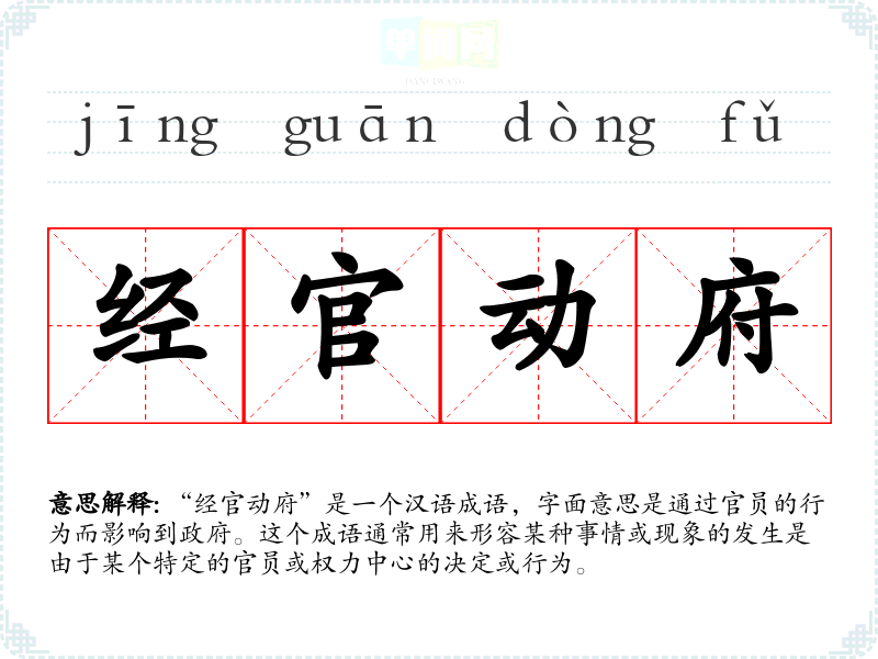 “经官动府”是一个汉语成语,字面意思是通过官员的行为而影响到政府。这个成语通常用来形容某种事情或现象的发生是由于某个特定的官员或权力中心的决定或行为。