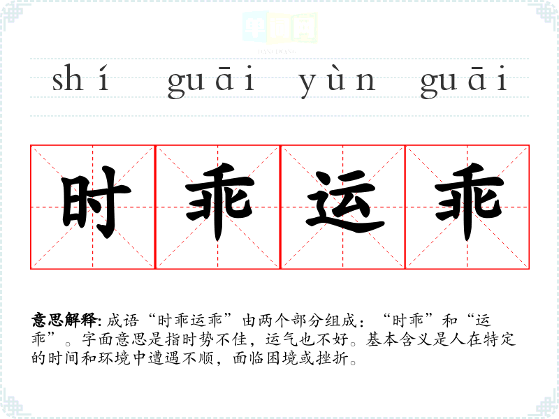 成语“时乖运乖”由两个部分组成:“时乖”和“运乖”。字面意思是指时势不佳,运气也不好。基本含义是人在特定的时间和环境中遭遇不顺,面临困境或挫折。