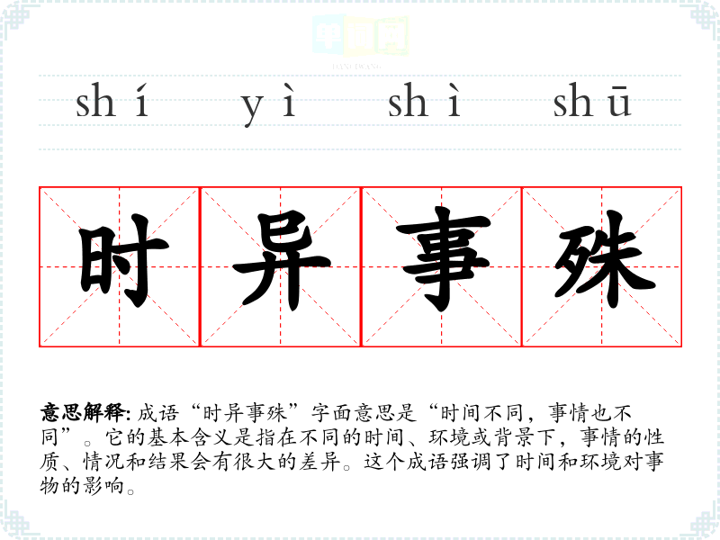 成语“时异事殊”字面意思是“时间不同,事情也不同”。它的基本含义是指在不同的时间、环境或背景下,事情的性质、情况和结果会有很大的差异。这个成语强调了时间和环境对事物的影响。
