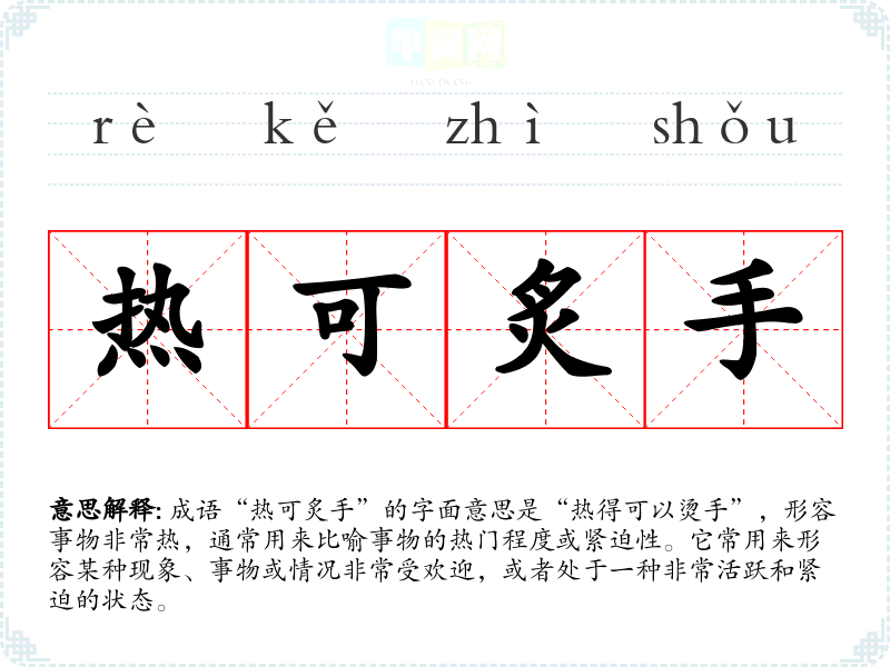 成语“热可炙手”的字面意思是“热得可以烫手”,形容事物非常热,通常用来比喻事物的热门程度或紧迫性。它常用来形容某种现象、事物或情况非常受欢迎,或者处于一种非常活跃和紧迫的状态。