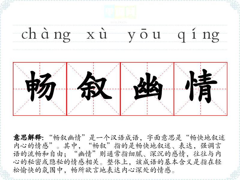 通过对“畅叙幽情”的学,我更加认识到情感交流的重要性。它不仅可以加深人与人之间的理解和信任,也能让人感受到被理解的温暖。在语言学中,能够恰当地使用这种成语,可以更好地表达自己的情感,增进与他人的沟通。