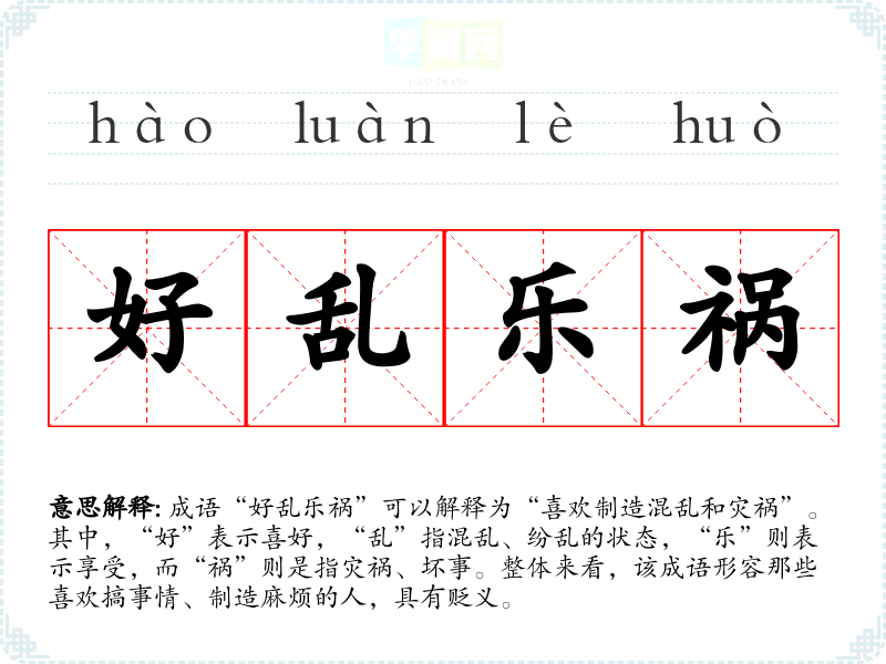 | 好乱乐祸 | 好、乐:喜欢,喜爱。喜欢捣乱和闯祸。 |