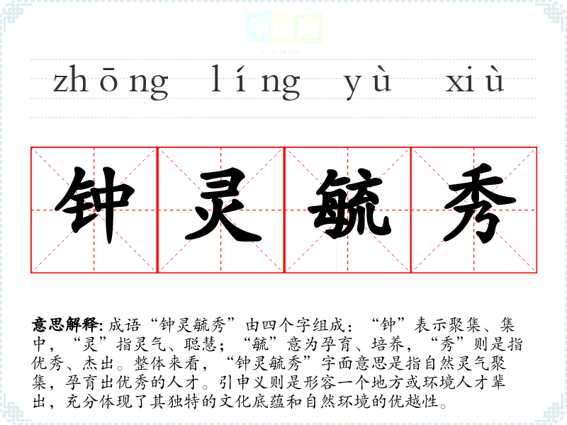 成语“钟灵毓秀”由四个字组成:“钟”表示聚集、集中,“灵”指灵气、聪慧;“毓”意为孕育、培养,“秀”则是指优秀、杰出。整体来看,“钟灵毓秀”字面意思是指自然灵气聚集,孕育出优秀的人才。引申义则是形容一个地方或环境人才辈出,充分体现了其独特的文化底蕴和自然环境的优越性。