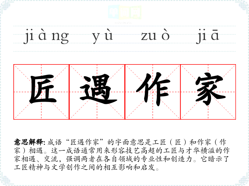 成语“匠遇作家”的字面意思是工匠(匠)和作家(作家)相遇。这一成语通常用来形容技艺高超的工匠与才华横溢的作家相遇、交流,强调两者在各自领域的专业性和创造力。它暗示了工匠精神与文学创作之间的相互影响和启发。