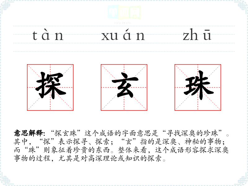 通过对“探玄珠”的学,我认识到它不仅是一种语言表达,更是一种人生态度。在学和生活中,保持对知识的渴求和探索精神是非常重要的。这个成语激励我在面对挑战时,不畏艰难,勇敢追寻真理。